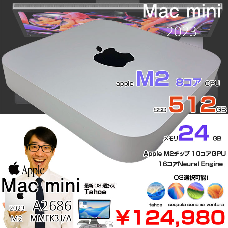 【中古パソコン】Apple Mac mini MMFK3J/A A2686 M2 2023 小型デスク 選べるOS [Apple M2 8コアCPU 10コアGPU メモリ24GB SSD512GB 無線 BT シルバー]:アウトレット