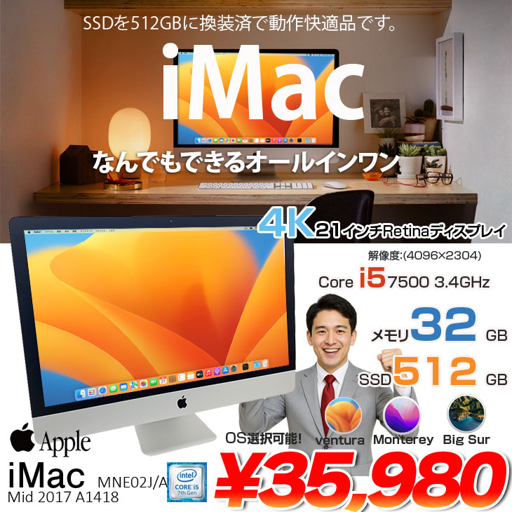 【中古パソコン SSD換装済】Apple iMac 21.5inch MNE02J/A A1418 4K 2017 一体型 選べるOS [Core i5 7500 メモリ32GB SSD512GB 無線 BT カメラ 21.5インチ] :アウトレット