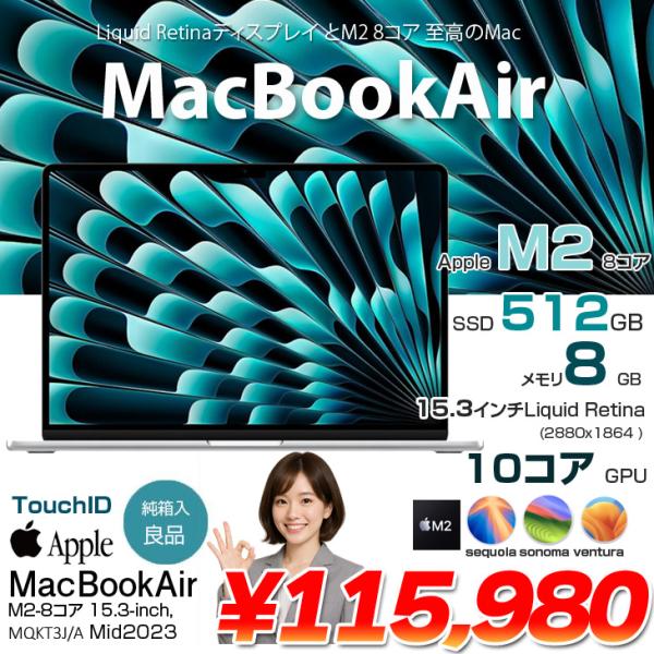 【中古パソコン】Apple MacBook Air 15.3inch MQKT3J/A A2941 2023 選べるOS TouchID [Apple M2 8コア メモリ8GB SSD512GB 無線 BT カメラ 15.3 Silver 純箱] :良品