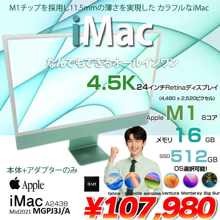 Apple iMac 24inch MGPJ3J/A A2438 4.5K 2021 一体型 選べるOS [Apple M1 8コア 16GB SSD512GB 無線 BT カメラ 24インチ 本体のみ Green ]:美品