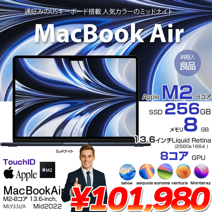 【中古パソコン】Apple MacBook Air 13.6inch MLY33J/A A2681 2022 選べるOS TouchID USキー [Apple M2 8コア 8GB SSD256GB 無線 BT カメラ 13.6 Midnight 純箱] :良品