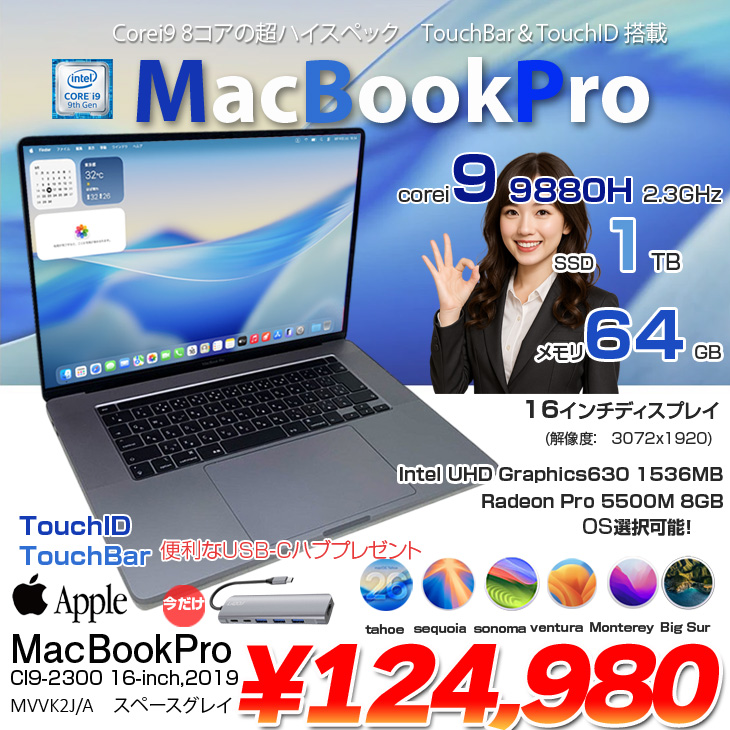 【中古パソコン】【今だけTYPE-Cハブ付】Apple MacBook Pro 16inch MVVK2J/A A2141 RP5500M 2019 選べるOS TouchBar TouchID [core i9 8コア 2.4GHz メモリ64GB SSD1TB 無線 BT カメラ 16インチ] :良品