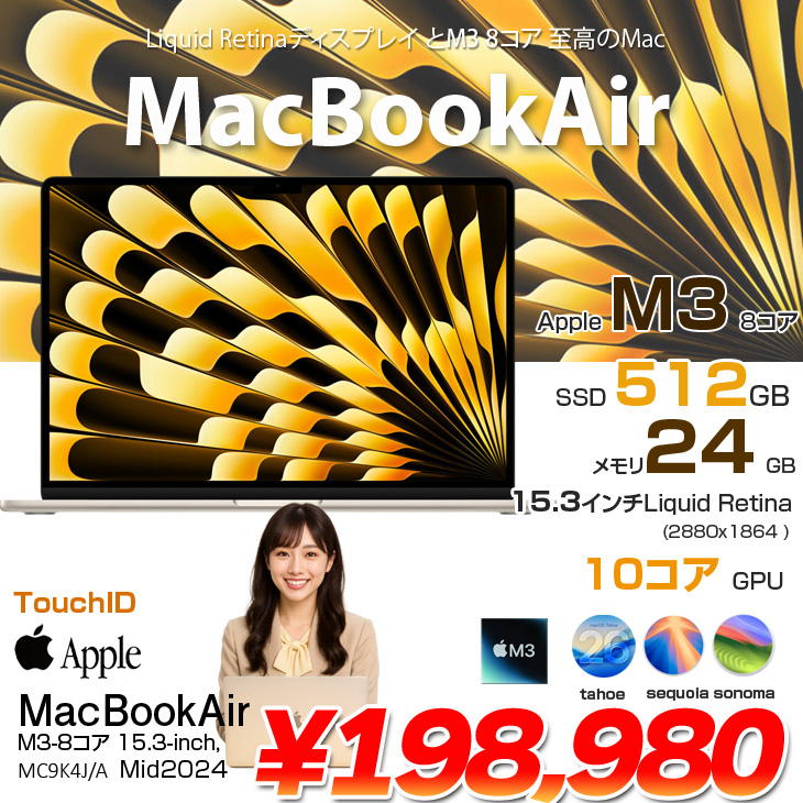 【中古パソコン】Apple MacBook Air 15.3inch MC9K4J/A A3114 2024 選べるOS TouchID [Apple M3 8コア メモリ24GB SSD512GB 無線 BT カメラ 15.3型 Starlight ] :美品