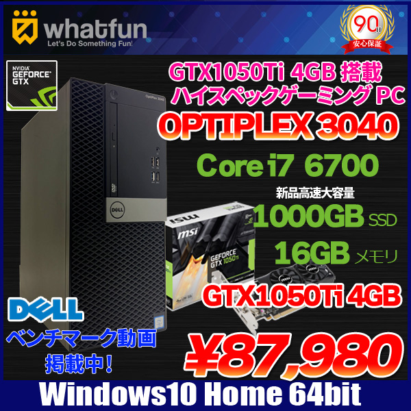 【中古パソコン】DELL 3040 ゲーミングパソコン GTX1050Ti 4GB搭載 Windows10 [Corei7 6700 3.4GHz メモリ16GB 大容量高速SSD1TB マルチ]
