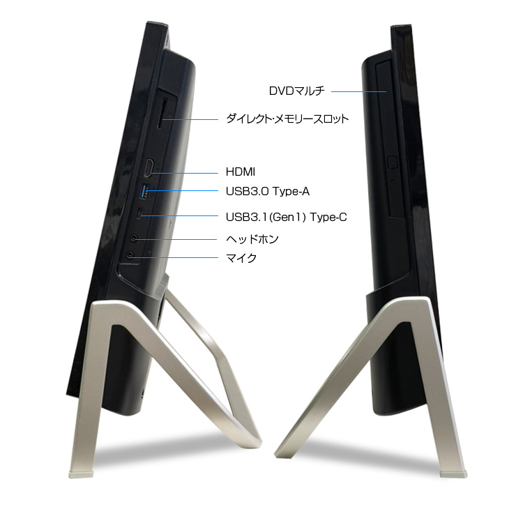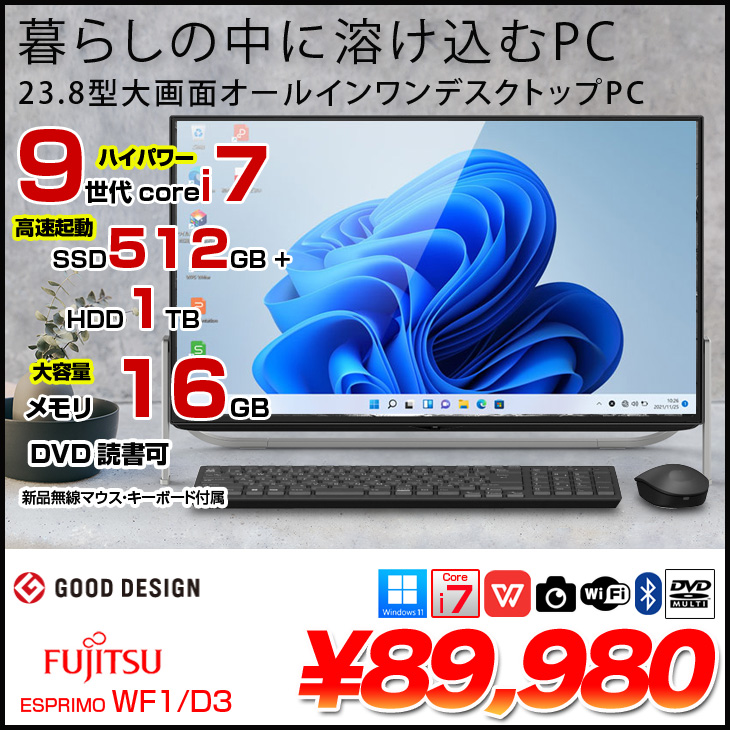 【中古デスクトップパソコン】富士通 ESPRIMO WF1/D3 FMVWD3F17 一体型 Office Win11home 新品キーマウス セット[Core i7 9750H メモリ16GB SSD512GB+HDD1TB カメラマルチ23.8型 BT]:良品