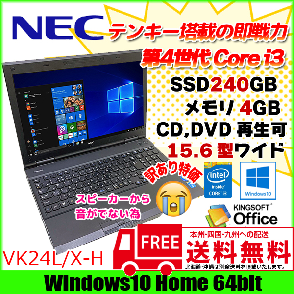 【中古パソコン】NEC VK24L/X-H 中古 ノートパソコン Office Win10 SSD塔載 第4世代 テンキー [Corei3 4000M 2.4GHz 4G SSD240GB DVD-ROM 15.6型 A4 ] :訳あり品