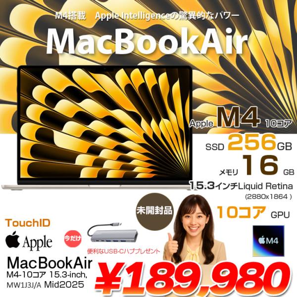 【未開封品 今だけTYPE-Cハブ】Apple MacBook Air 15.3inch MW1J3J/A A3241 2025 TouchID [Apple M4 10コア 16GB SSD256GB 無線 BT カメラ 15.3型 Starlight 純箱 ] :未開封品