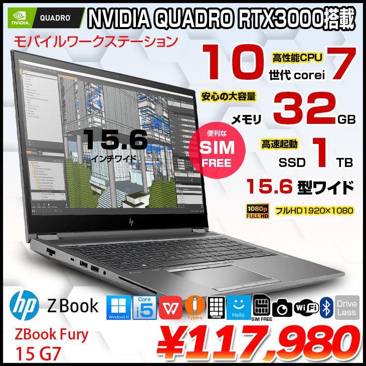 【中古パソコン】【SIMフリー】ZBook Fury 15 G7 Win11 テンキー RTX3000 [Corei7 10850H メモリ32GB SSD1TB 無線 カメラ 15.6型 ] :アウトレット