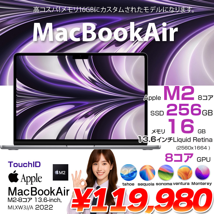 Apple MacBook Air 13.6inch MLXW3J/A A2681 2022 選べるOS TouchID [Apple M2 8コア 16GB 256GB 無線 BT カメラ 13.6 Space Gray] :アウトレット