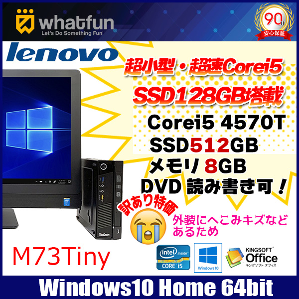 【中古パソコン】Lenovo M73 Tiny 中古デスクトップパソコン Win10 極小サイズ 第四世代 [Corei5 4570T 2.9GHz メモリ8G SSD512GB マルチ USB3.0 ]:訳あり