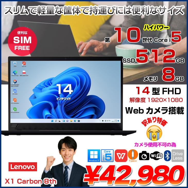 【中古パソコン】Lenovo X1 Carbon gen8 中古 ノート Office Win11 第10世代 [Core i5 10210U メモリ8GB SSD512GB 14型]:訳あり(カメラ×)