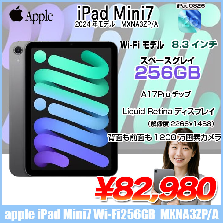 Apple iPad mini7 MXNA3ZP/A A2993 第7世代 Wi-Fi 256GB 2024年モデル [ A17 Pro 256GB 8.3型 iPadOS26 スペースグレイ ] :良品