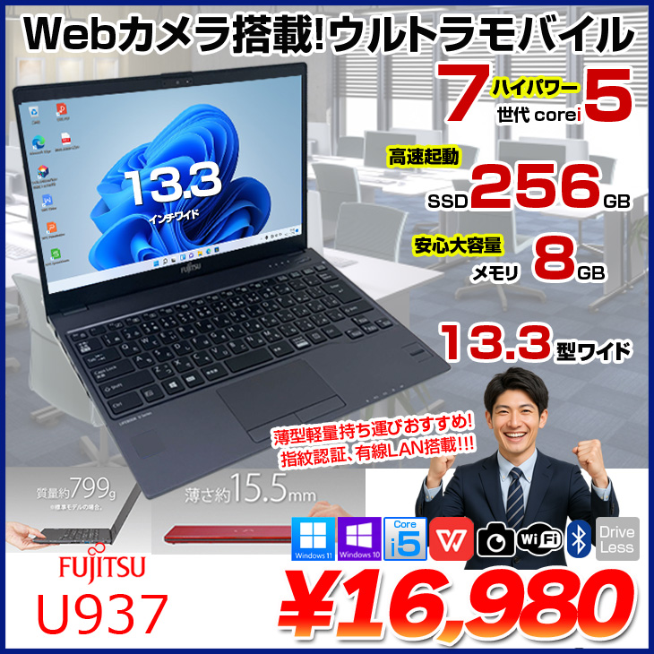 富士通 LIFEBOOK U937 中古 ノートOffice 選べるOS Win10 or Win11 第7世代[Core i5 7300U メモリ8GB SSD256GB 無線 カメラ 13.3型] :アウトレット