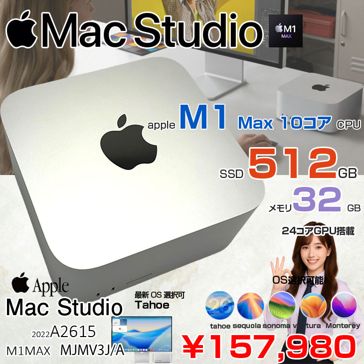 Apple Mac Studio MJMV3J/A A2615 M1 Max 2022 小型デスク 選べるOS [Apple M1 Max 10コア 24コアGPU メモリ32GB SSD512GB 無線 BT シルバー 純箱 ]:良品