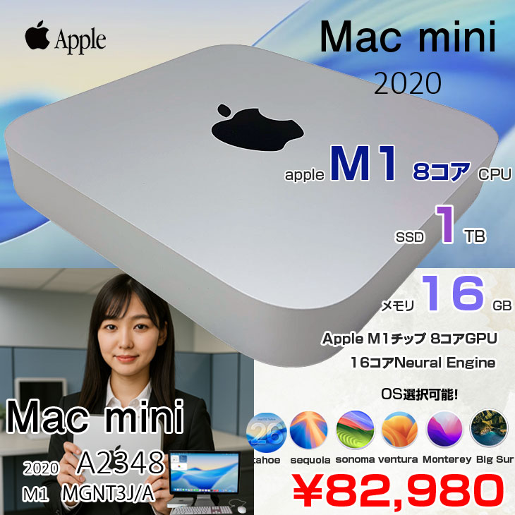 Apple Mac mini MGNT3J/A A2348 M1 2020 小型デスク 選べるOS [Apple M1 8コア メモリ16GB SSD1TB 無線 BT シルバー ]:良品