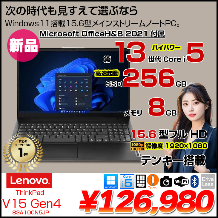 【新品パソコン】Lenovo V15 Gen4 83A100N5JP ノート Office 2021HB付属 Win11 第13世代[Core i5 13420H メモリ8GB SSD256GB カメラ 15.6型]:新品