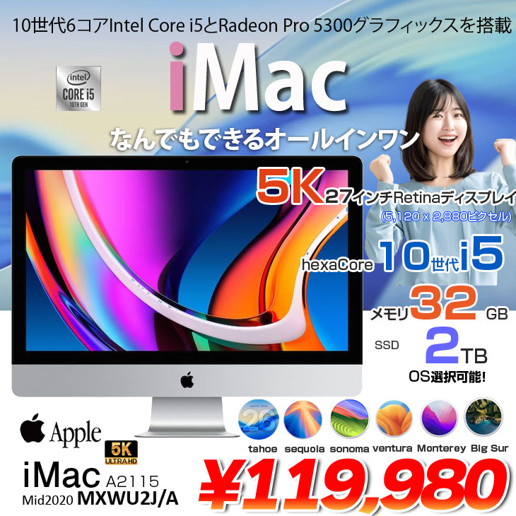 Apple iMac 27inch MXWU2J/A A2115 5K 2020 一体型 選べるOS [Core i5 10600 32GB SSD2TB RP5300(4GB) 無線 BT カメラ 27インチ ]:良品