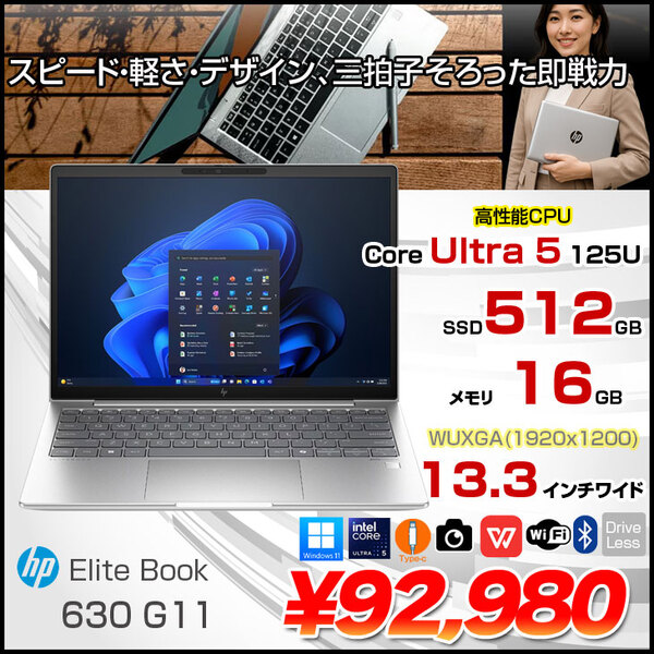 【中古パソコン】HP EliteBook 630 G11 Win11Pro [Core Ultra 5 125U メモリ16GB SSD512GB 無線 カメラ Type-C フルHD 13.3型] :良品