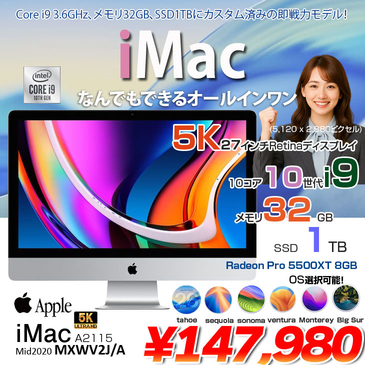 Apple iMac 27inch MXWV2J/A A2115 5K 2020 一体型 選べるOS [Core i9 10910 メモリ32GB SSD1TB RP5500XT(8GB) 無線 BT カメラ 27インチ ]:良品