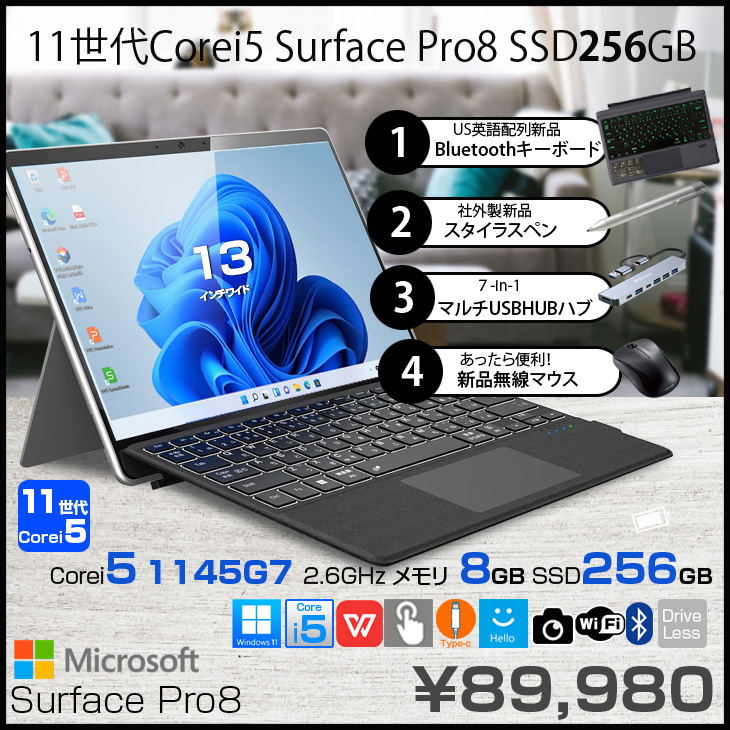 Microsoft Surface Pro8 8PQ-00010 中古 タブレット Office Win11 7in1ハブ+新品BTキー+ペン+マウス[core i5 1135G7 メモリ8GB SSD256GB カメラ 13インチ]:良品