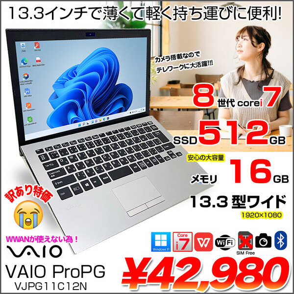 【中古パソコン】VAIO ProPG VJPG11C12N ノート Office Win11 フルHD [Corei7 8550U 16GB SSD512GB 無線 カメラ 13.3 シルバー]:訳あり(WWAN×)