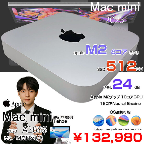 Apple Mac mini MMFK3J/A A2686 M2 2023 小型デスク 選べるOS [Apple M2 8コアCPU 10コアGPU メモリ24GB SSD512GB 無線 BT シル