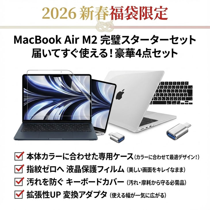 【2026新春 MacBook Air カラーが選べる福袋】Apple MacBook Air 13.6inch A2681 Mid2022 選べるOS [Apple M2 8コア 8GB 256GB 無線 BT カメラ 13.6]:良品福袋