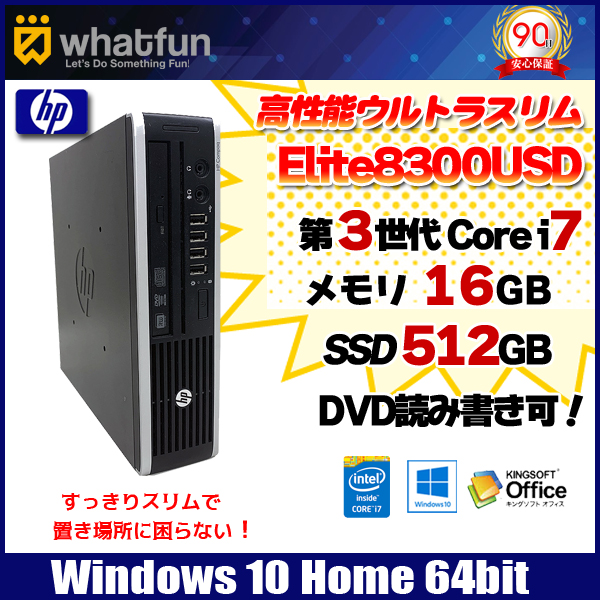 【中古パソコン】HP EliteDesk8300 USD 中古 ウルトラスリム デスクトップパソコン Win10 Office 第三世代 [core i7 3770s 3.1GHz メモリ16GB SSD512GB マルチ USB3.0 ]
