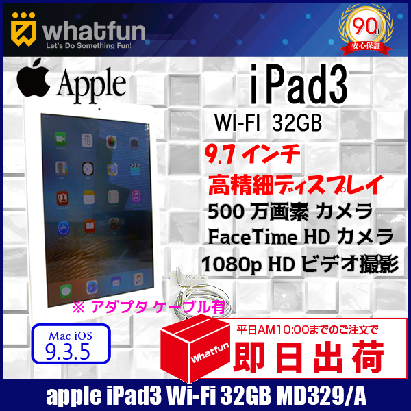 【中古iPad】Apple iPad 第3世代 MD329J/A Retinaディスプレイ Wi-Fiモデル 32GB [ A5X 1GHz 32GB(SSD) 9.7インチ OS 9.3.5 White] :良品 中古 アイパッド3