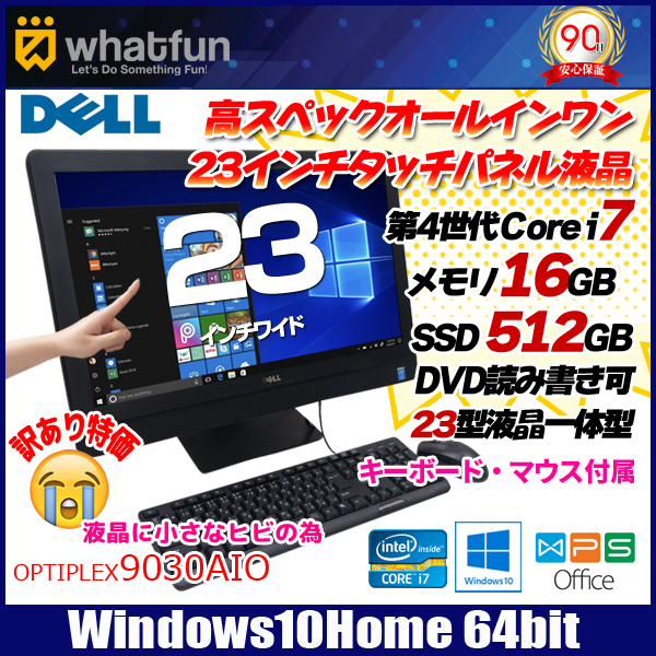 【中古パソコン】DELL OPTIPLEX 9030 AIO 中古 23型 タッチパネル 一体型デスクトップ Wind10 無線 カメラ [corei7 4790S 3.2GHz メモリ16G SSD512GB マルチ BT]:訳あり品