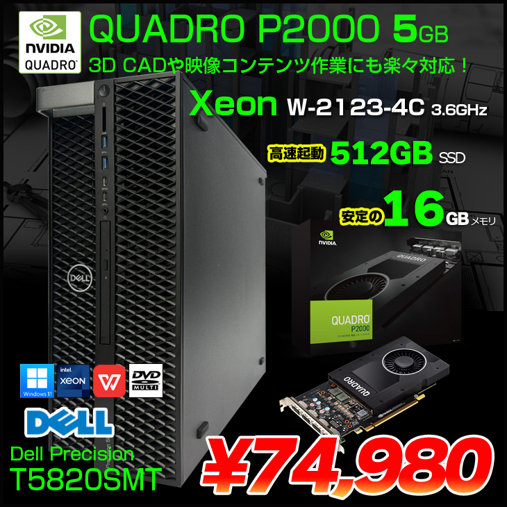 【中古パソコン】DELL Precision T5820SMT Xeon ワークステーション 4画面出力対応 Quadro P2000[Xeon W-2123 4コア メモリ16GB SSD512GB マルチ]:良品