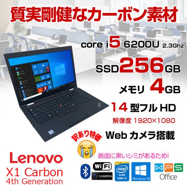 【中古パソコン】Lenovo X1 Carbon 4th Generation(2016) 中古 ノート Office Win10 第6世代 カメラ 高解像度 [core i5 6200U 2.3GHz 4G SSD256GB 14型 ] :訳あり