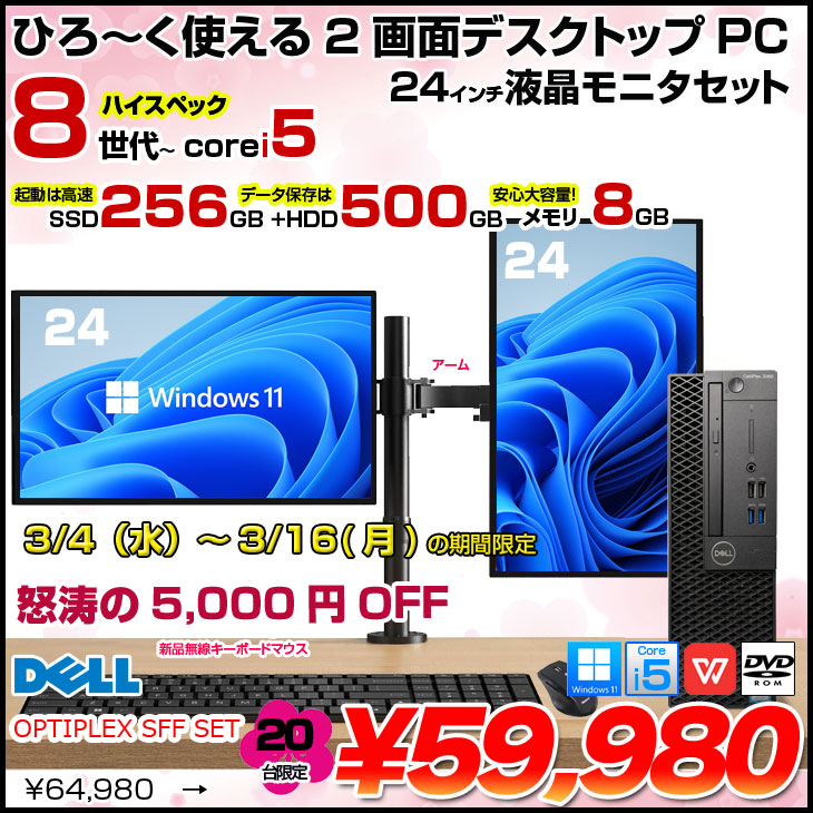 【3/4-16まで期間限定価格】DELL OPTIPLEX Corei5 SFF 24インチ2画面デュアルモニタ仕様 小型 デスク Office Win11 キー・マウス付 セット [Core i5 8世代以降CPU 8GB SSD256GB+HDD500GB] :良品