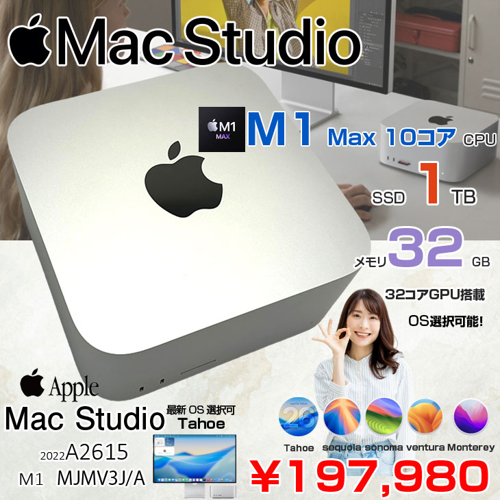 【中古パソコン】Apple Mac Studio MJMV3J/A A2615 M1 Max 2022 小型デスク 選べるOS [Apple M1 Max 10コア 32コアGPU 32GB SSD1TB 無線 BT シルバー ]:良品