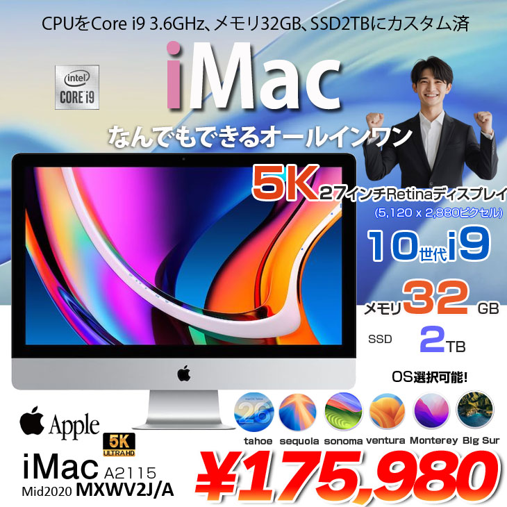 【中古パソコン】Apple iMac 27inch MXWV2J/A A2115 5K 2020 一体型 選べるOS [Core i9 10910 3.6GHz メモリ32GB SSD2TB RP5500XT(8GB) 無線 BT カメラ 27インチ ]:良品