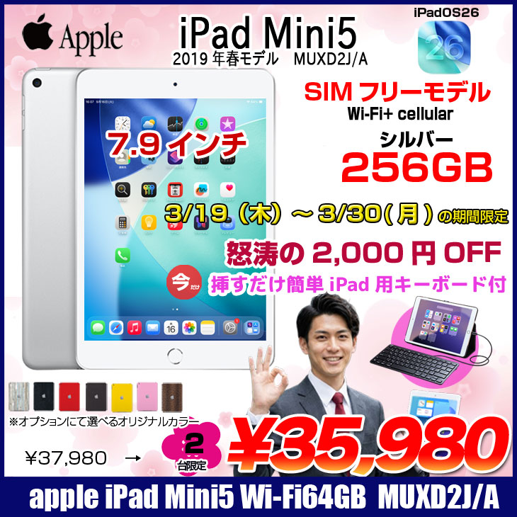 【中古iPad】【SIMロック】Apple iPad mini5 MUXD2J/A A2124 第5世代 Wi-Fi-cel 256GB [ A12 SSD256GB 7.9 iPadOS 26 シルバー ] :良品