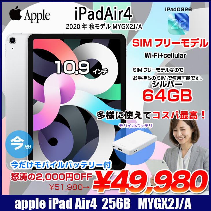 【中古iPad 今だけモバイルバッテリー付】Apple iPadAir4 4世代 MYGX2J/A SIMロック解除済 Wi-Fi+cel 64GB A2072 [A14 10.9 iPadOS26 シルバー] :良品