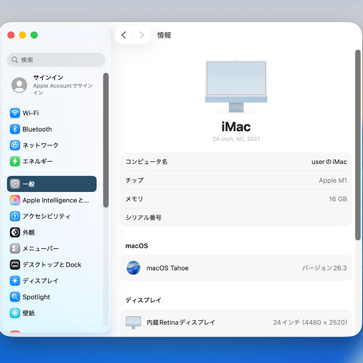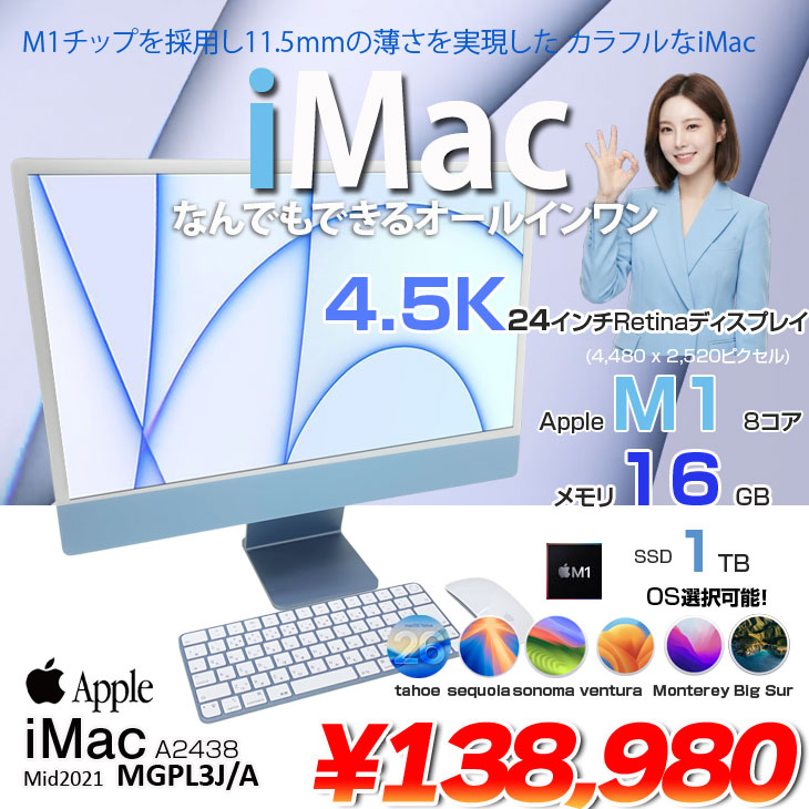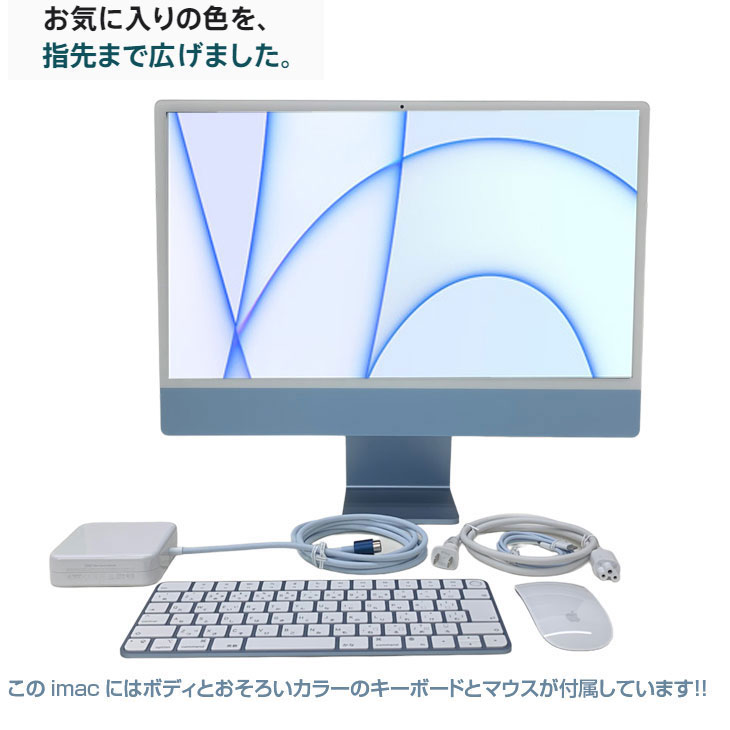 【中古パソコン】Apple iMac 24inch MGPL3J/A A2438 4.5K 2021 一体型 選べるOS Touch ID [Apple M1 8コア 16GB SSD1TB 無線 BT カメラ 24インチ Blue ]:良品