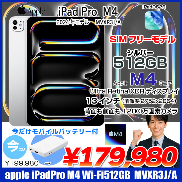 【今だけモバイルバッテリー付】Apple iPad Pro M4 MVXR3J/A A2836 Wi-Fi+cel 512GB 2024年モデル [Apple M4 9コア 13インチ 12MPカメラ iPadOS26 Silver] :良品