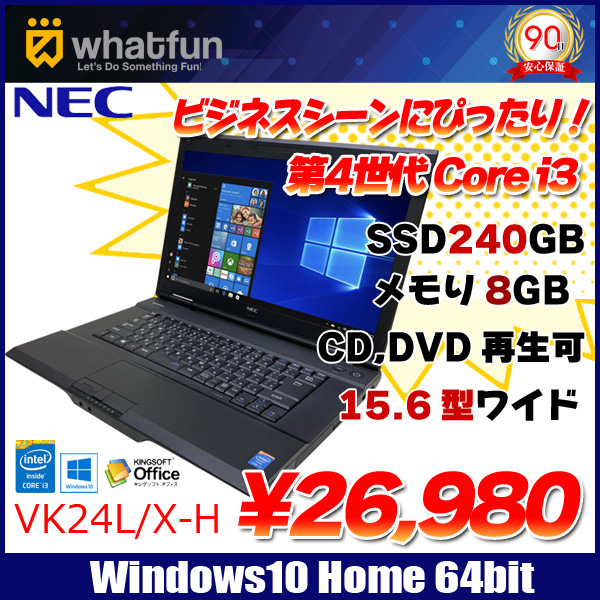 【中古パソコン】NEC VK24L/X-H 中古 ノートパソコン Office Win10 SSD塔載 第4世代 [Corei3 4000M 2.4GHz 8G SSD240GB DVD-ROM 15.6型 A4 ] :良品