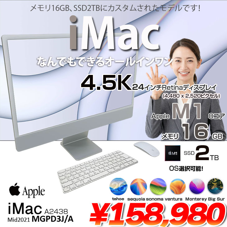 【中古パソコン】Apple iMac 24inch MGPD3J/A A2438 4.5K 2021 一体型 選べるOS Touch ID [Apple M1 8コア 16GB SSD2TB 無線 BT カメラ 24インチ Silver 純箱 ]:美品