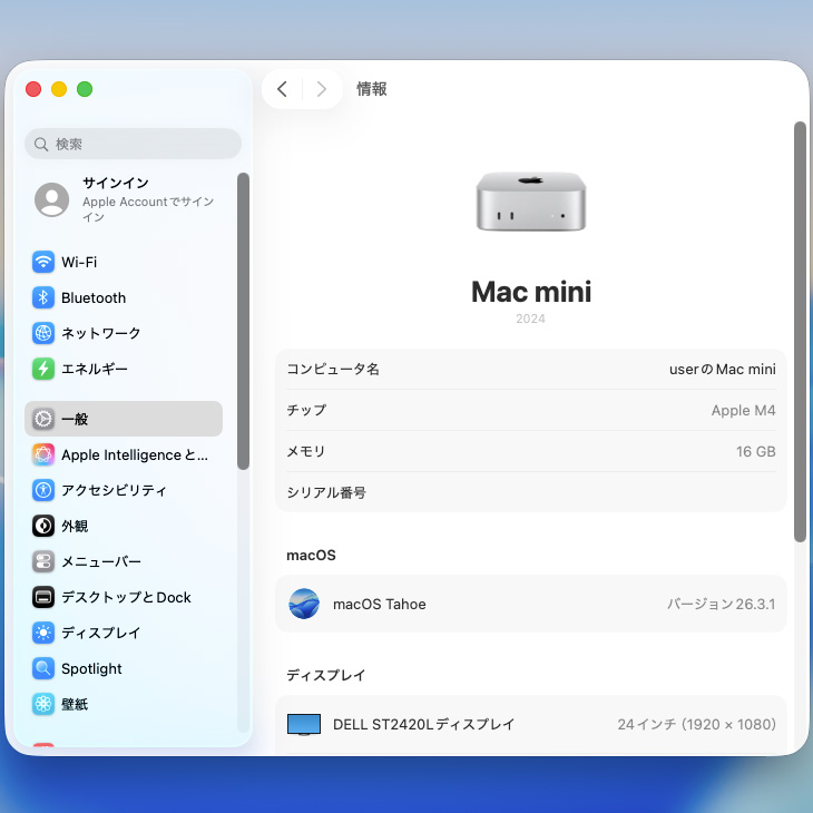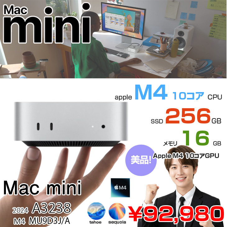 【中古パソコン】Apple Mac mini MU9D3J/A A3238 M4 2024 手のひらサイズ小型デスク [Apple M4 10コア メモリ16GB SSD256GB 無線 BT シルバー ]:良品