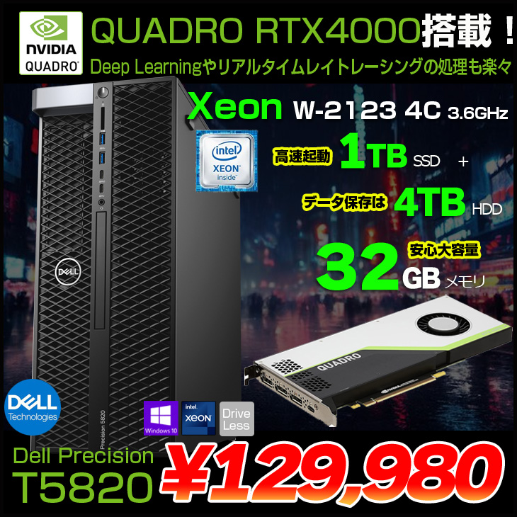 【中古パソコン】DELL Precision T5820SMT Xeon ワークステーション クリエーター Quadro RTX4000 搭載 Win11 [Xeon W-2123 4C メモリ32GB SSD1TB+HDD4TB]:良品