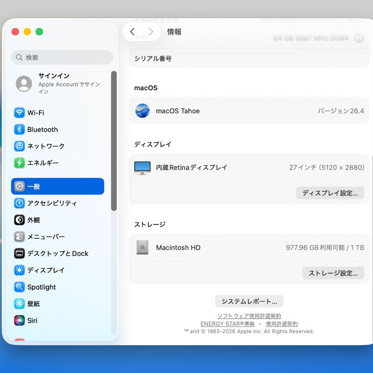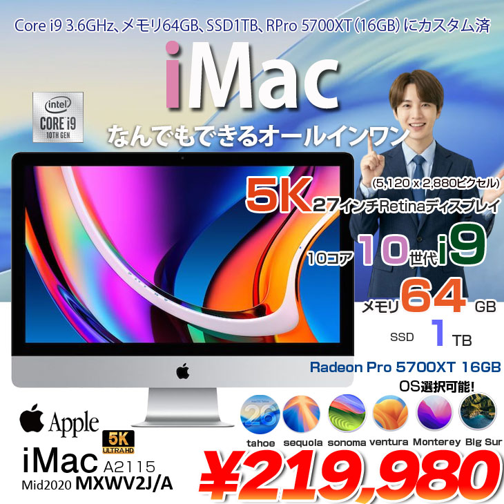 【中古パソコン】Apple iMac 27inch MXWV2J/A A2115 5K 2020 一体型 [Core i9 10910 メモリ64GB SSD1TB RP5700XT(16GB) 無線 BT カメラ 27インチ ]:良品