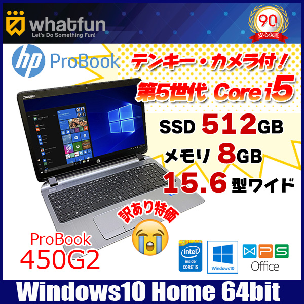 【中古パソコン】HP PROBOOK 450G2 中古 ノート Office Win10 カメラ テンキー [core i5 5200U 2.2GHz 8GB SSD512GB DVDマルチ 15.6型 USB3.0 ] :訳あり
