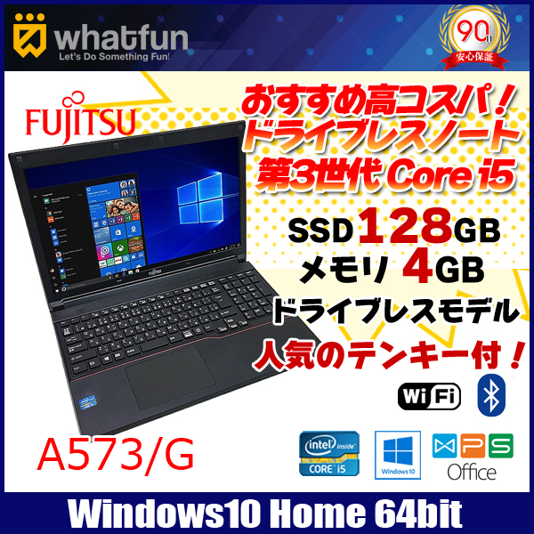 【中古パソコン】富士通 A573/G 中古 ノート Office Win10 第3世代 テンキー [corei5 3340M 2.7GHz 4GB SSD128GB 無線 15.6型 HDMI USB3.0 ] :良品