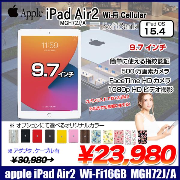 【中古iPad】Apple iPad Air2 MGH72J/A Retina Softbank Wi-Fi+Cellular 16GB 指紋認証 選べるカラー [ A8X 16GB(SSD) 9.7インチ iPadOS 15.4シルバー ] :良品 中古