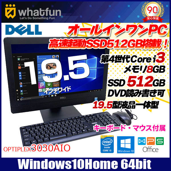 【中古パソコン】DELL OPTIPLEX 3030 AIO 中古 19.5型 一体型デスクトップパソコン Win10 無線 カメラ [corei3 4150 3.5GHz メモリ8G SSD512GB マルチ]:良品