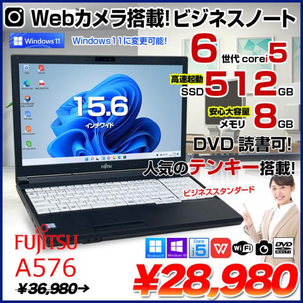 【中古パソコン】富士通 LIFEBOOK A576 中古 ノートパソコン Office 選べるWin11 or Win10 テンキー [Core i5 6200U 8GB SSD512GB マルチ カメラ BT 無線 15.6型 ] :良品