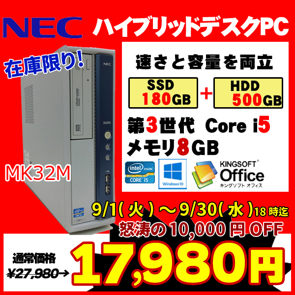 【中古パソコン】NEC ハイブリッドデスクトップパソコン MK32 高速SSD+大容量HDD Office Win10[Core i5 3470 3.2GHz 8GB 180GB(SSD)&HDD500GB マルチ ]